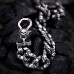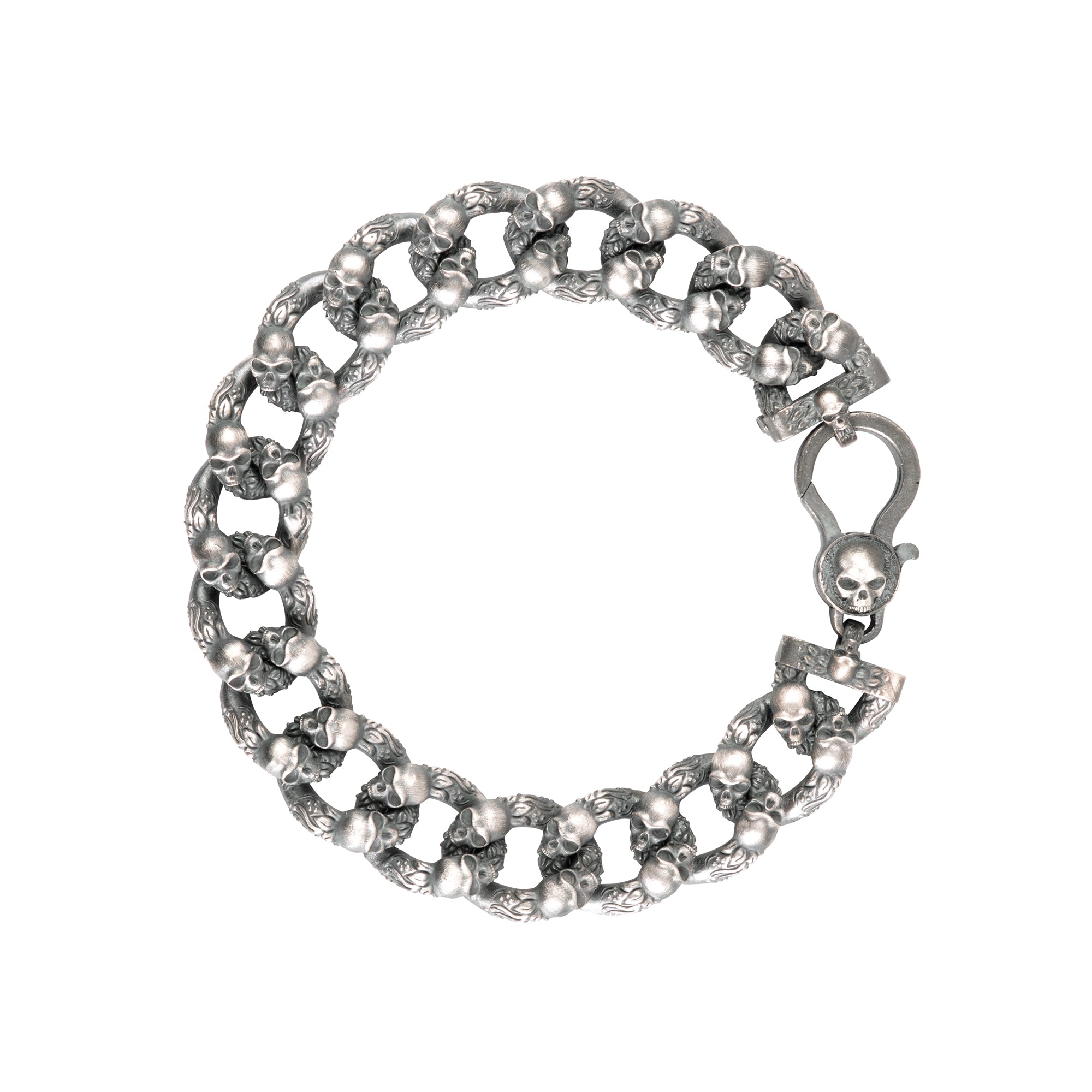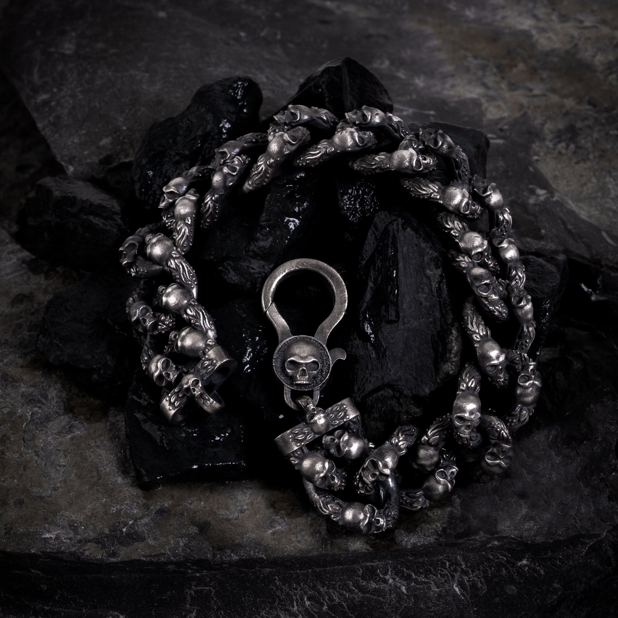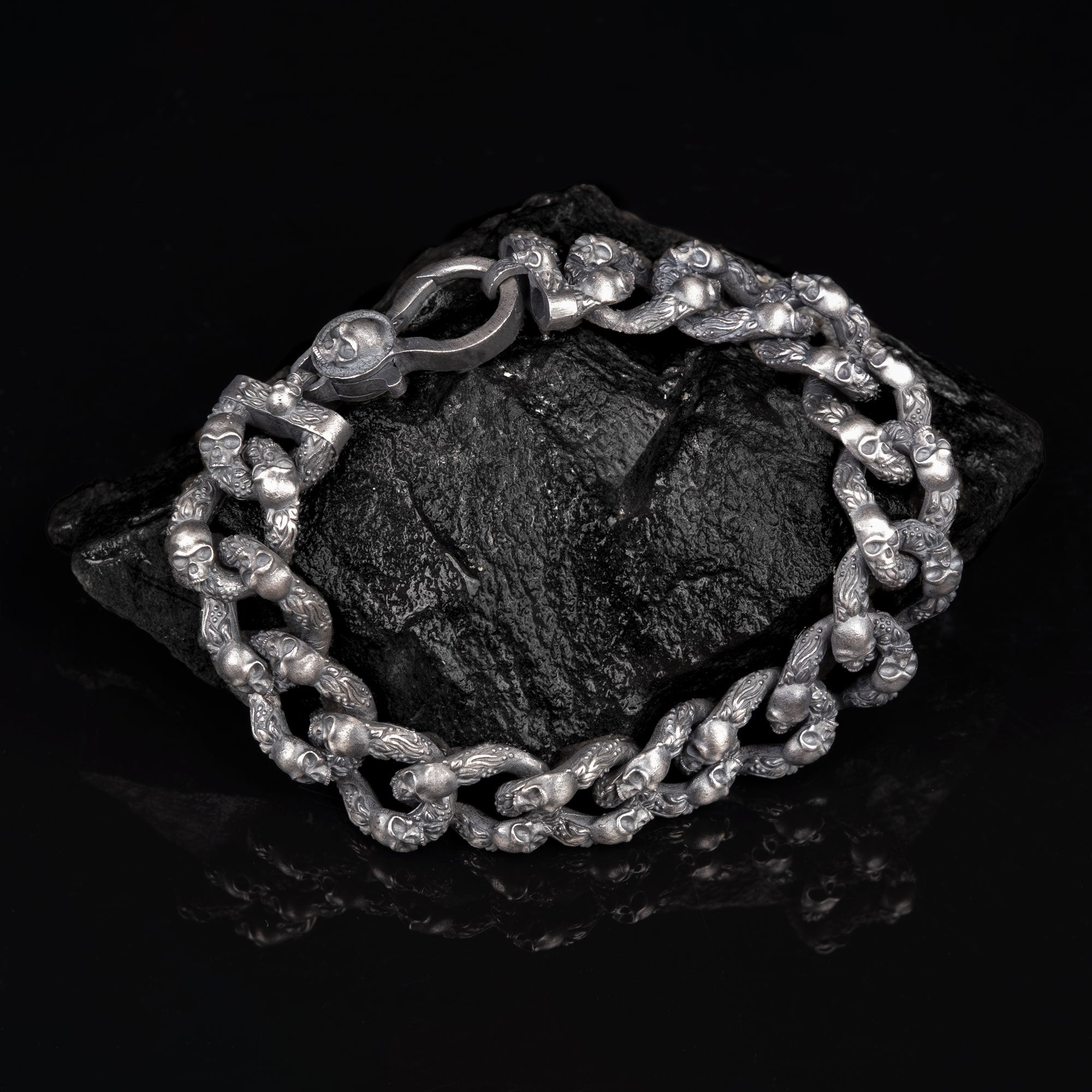 Inspired by the ultimate symbol of confronting mortality and embracing a fierce, fearless spirit. This commanding Skull Link Bracelet, featuring a rugged chain of intricately detailed miniature skulls, embodies uncompromising truth, raw power, and an unshakeable defiance of the ephemeral. A bold tribute to the dark warrior aesthetic and the Memento Mori philosophy.