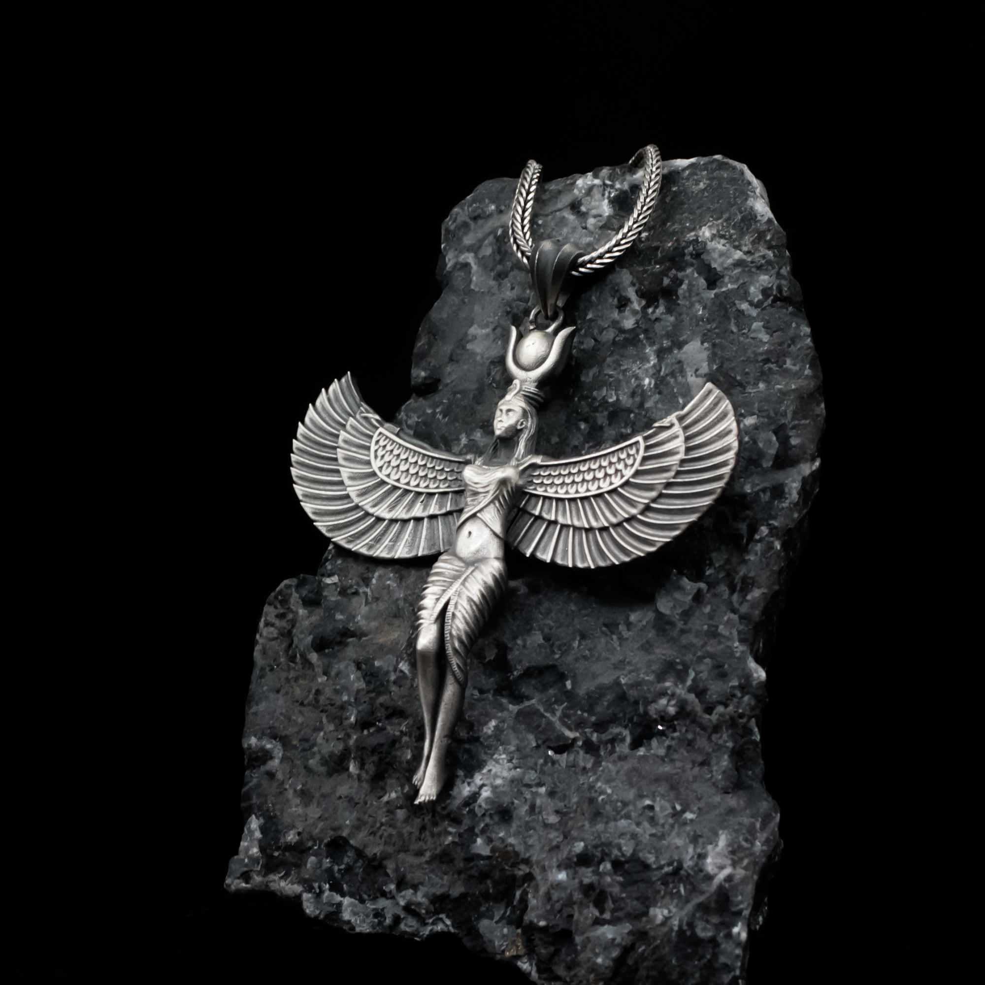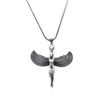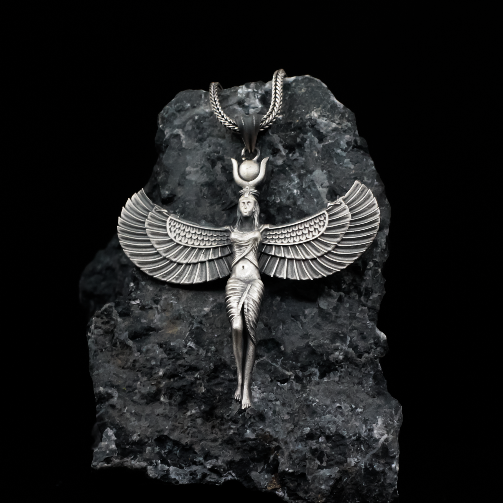 Inspired by the ultimate symbol of maternal protection and divine, celestial power. This commanding Winged Goddess pendant, depicted with outstretched, powerful wings and a crescent crown (likely Isis or a similar deity), embodies eternal life, healing, and mastery over the natural world. A bold tribute to feminine strength and ancient, spiritual wisdom.