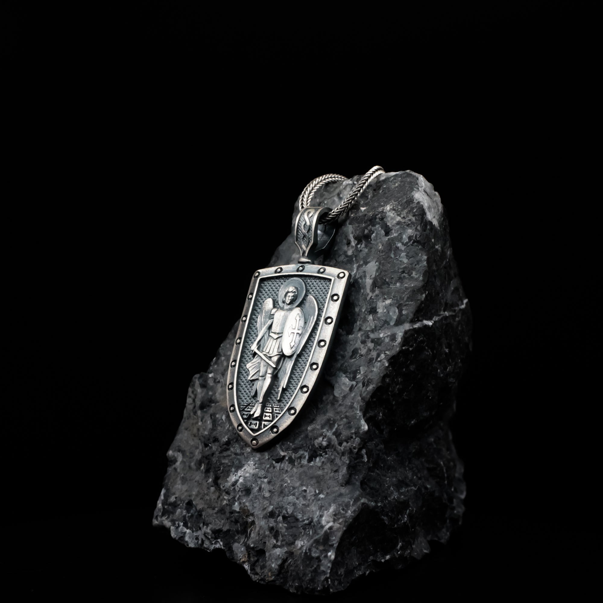 Inspired by the ultimate force of Heavenly Protection and Spiritual Warfare. This powerful shield pendant features the Archangel Michael, sword in hand, embodying unwavering faith, courage, and the defense of the righteous. The studded shield frame emphasizes its sacred, protective nature. A bold tribute to divine guardianship and conquering darkness.