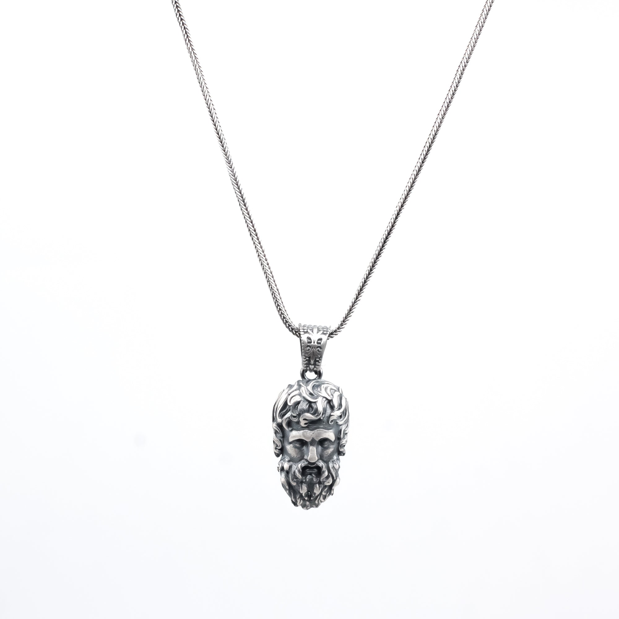 Inspired by the noble visage of an Ancient Greek God or Hero (e.g., Zeus or Hercules), this pendant captures the essence of wise power, unwavering resolve, and divine authority. The detailed, expressive face embodies deep wisdom and stoic strength, watching over the wearer. A bold tribute to classical masculinity and enduring mythological legacy.